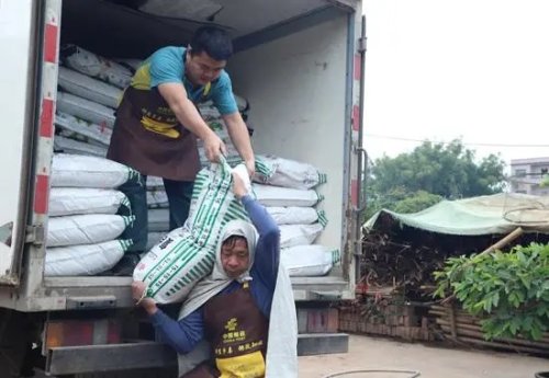 图为贵港市邮政分公司工作人员搬运肥料。覃东新摄