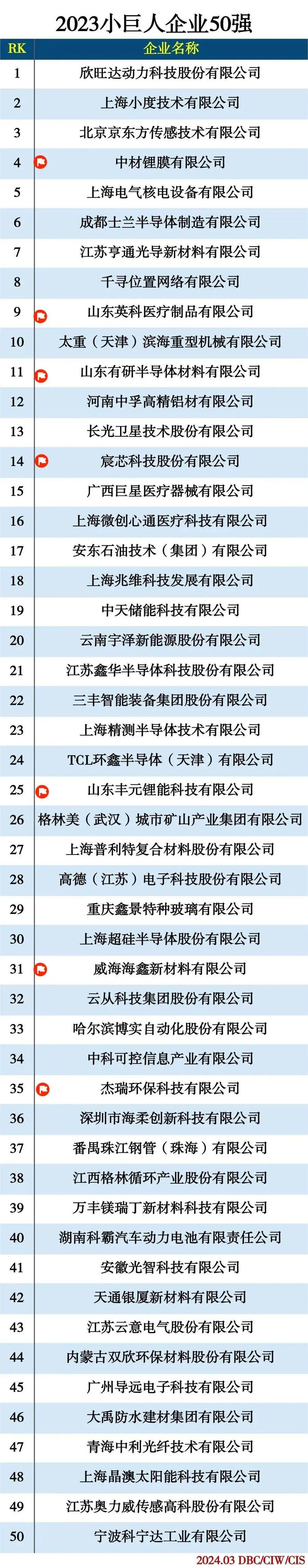 近日,国际高新技术研究院对外发布2023“小巨人”企业50强榜单,山东共有7家企业入选,分别是:中材锂膜有限公司,山东英科医疗制品有限公司,山东有研半导体材料有限公司,宸芯科技股份有限公司,山东丰元锂能科技有限公司,威海海鑫新材料有限公司,杰瑞环保科技有限公司。