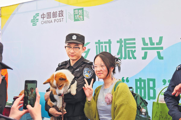 4月20日,全网流量过亿的柯基警犬福仔,在执行巡逻任务的间隙来到潍坊风筝邮局参加“巡回粉丝见面会”,与粉丝亲密互动。