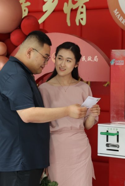 5月20日,恰逢中国传统节气小满,众多新人在这个充满浪漫氛围的日子里进行婚姻登记,滨州市博兴县邮政分公司联合当地民政部门开展“邮你一生 定格永恒”幸福520主题活动,在博兴县民政局大厅安装全市首台幸福传递有声名片打印机,现场为婚姻登记领证的新人定制专属声像结合的纪念明信片。