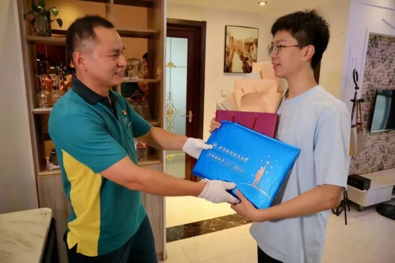常州市邮政分公司天宁揽投部投递员、“常州市五一劳动奖章”获得者徐大磊冒雨仅用20分钟,将北京航空航天大学的录取通知书送达考生贾沐洋手中,并向他表示祝贺。