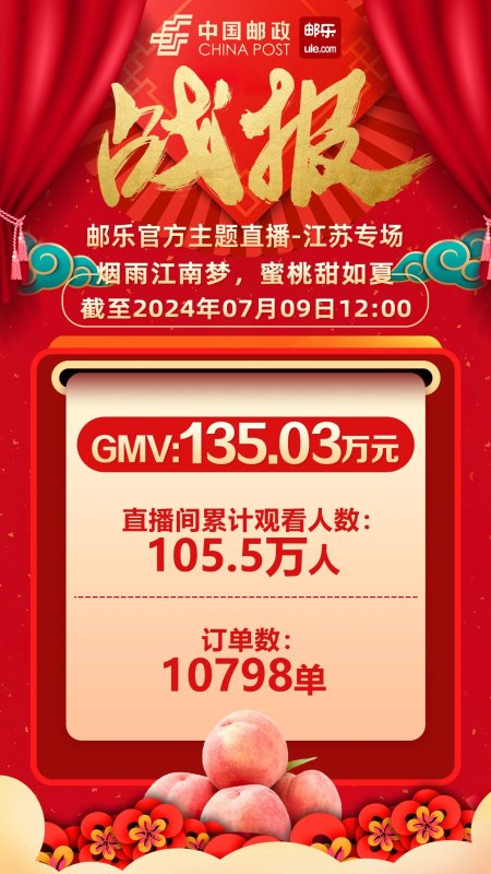 7月8日,省分公司精心组织,邮乐直播基地支撑,开展了“烟雨江南梦,蜜桃甜如夏”主题直播活动。直播间观看人数超百万人,实现订单数超万笔,交易额达135万元。