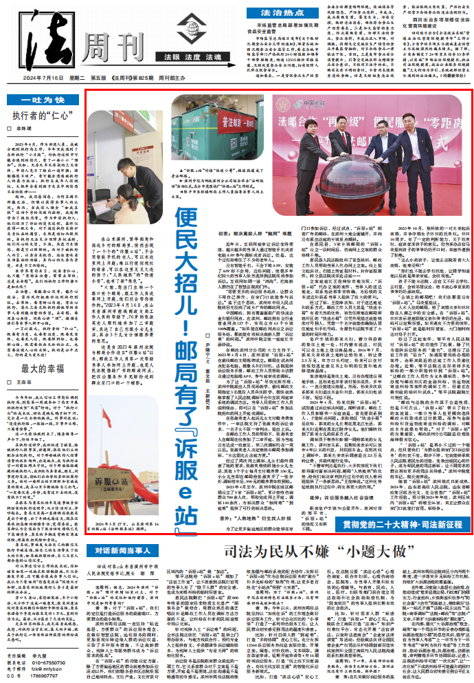 随着“诉服e站”滨州模式日渐成熟,2024年,山东省高级人民法院、山东省邮政集团联合发文,在全省推广“诉服e站”工作经验。预计到2024年年底,滨州区域内“诉服e站”将增至56家,真正让群众在家门口就能打官司、解纷争。