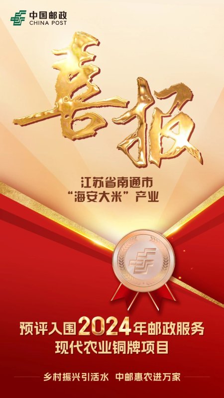 南通海安市邮政分公司认真贯彻服务乡村振兴“十大工程”工作要求,积极发挥属地优势,加强内外联系、深化上下联动,推动“海安大米”香飘全国。近日,“海安大米”成功入选2024年第二批全国名特优新农产品名录,“海安大米”产业预评入围2024年邮政服务现代农业铜牌项目。