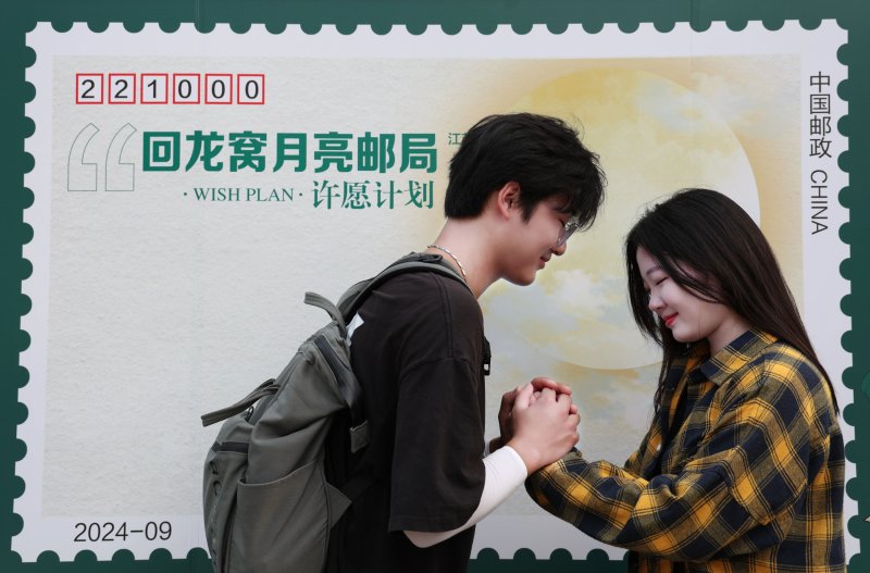 “希望我们的感情像中秋的月亮一样圆满无缺、温柔宁静、美好长久,即便偶经挫折,也能执手共进。”来自外地的小情侣在月亮主题邮局前共同许下对未来生活的期盼。