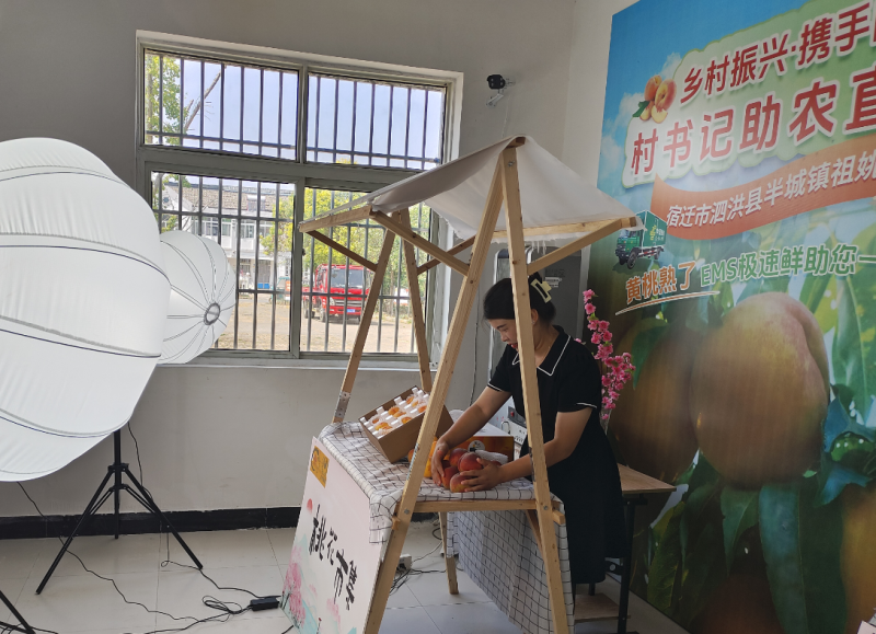 在半城镇祖姚村党群服务中心,泗洪县分公司搭建了支部书记助农直播基地,由支部书记带头直播销售黄桃,激发农村电商活力,带领村民共同致富。