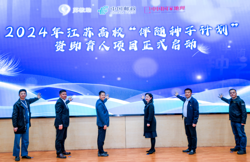 活动现场,南京邮电大学党委常委、副校长谢平致辞,江苏省学生资助管理中心卫艳、中国邮政江苏省分公司市场部总经理王承东等领导共同启动“2024年江苏高校伴随种子计划资助育人项目”,并为17所入选项目的高校发放“爱心礼包”。