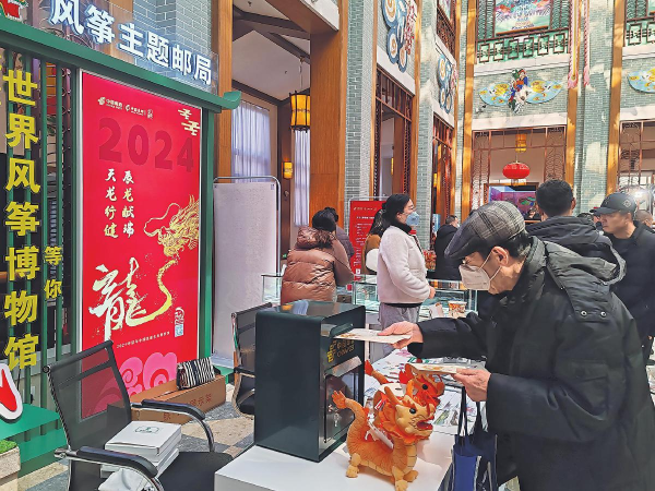 《风筝(三)》特种邮票发行后,潍坊风筝博物馆主动与潍坊市分公司取得联系,计划在博物馆内打造风筝主题邮局。今年初,全国首家风筝主题邮局在风筝博物馆正式开业。在风筝主题邮局里,《风筝(三)》特种邮票系列邮资票品、风筝异形明信片、潍坊风光明信片、以潍坊代表性风筝为原型的冰箱贴……各种集邮文创产品琳琅满目,凝缩着潍坊文脉的元素符号隆重登场,吸引着游客们的眼球。