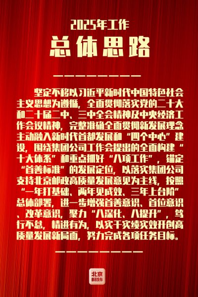 孙洪均在报告中指出2025年北京邮政发展工作的总体思路是:坚定不移以习近平新时代中国特色社会主义思想为遵循,全面贯彻落实党的二十大和二十届二中、三中全会精神及中央经济工作会议精神,完整准确全面贯彻新发展理念,主动融入新时代首都发展和“四个中心”建设,围绕集团公司工作会提出的全面构建“十大体系”和重点抓好“八项工作”,锚定“首善标准”的发展定位,以落实集团公司支持北京邮政高质量发展意见为主线,按照“一年打基础、两年见成效、三年上台阶”总体部署,进一步增强首善意识、首位意识、改革意识,聚力“八深化”“八提升”,笃行不怠,精进有为,以实干实绩实效开创高质量发展新局面,努力完成各项任务目标。