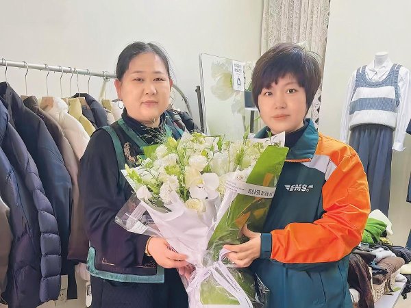 图为揽投员为客户送上充满爱意的鲜花。