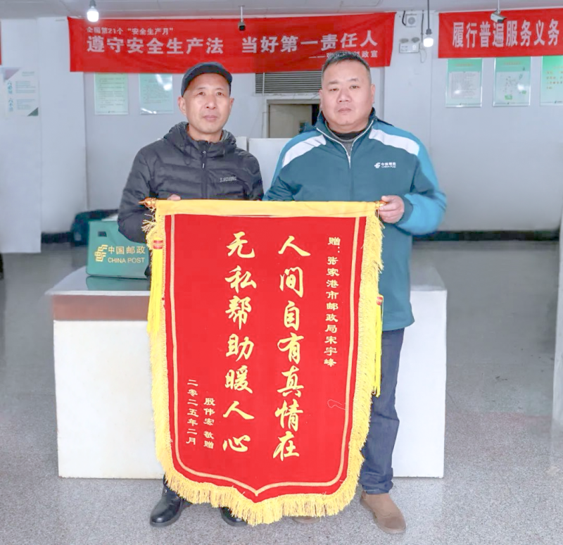“可算找到这位邮政好心人了!多亏有你,不然我父亲这个冬天就难熬了。”近日,在苏州张家港市邮政分公司的城区揽投部,市民殷先生将一面写着“人间自有真情在 无私帮助暖人心”的锦旗送到了揽投员宋宇峰的手中,并代表全家向他表示深深的感谢。