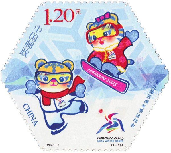 该套邮票采用六边形票幅,以本届亚冬会的吉祥物“滨滨”“妮妮”为画面主体,辅之会徽及部分核心图形加以表现,画面主题突出、构图简约现代、色调纯净明快,充分展现出本届亚冬会的鲜明特色。该套邮票采用高网线影写版印刷工艺,以蓝色为衬底基调,配合特种珠光材料,增强背景视觉效果,丰富视觉层次。同时,辅以雪花形异型齿孔和雪花色标,将工艺与主题融为一体,突出亚冬会举办地的冰雪美感。荧光油墨的运用,在紫外灯光下,烘托出运动的激情与热烈。