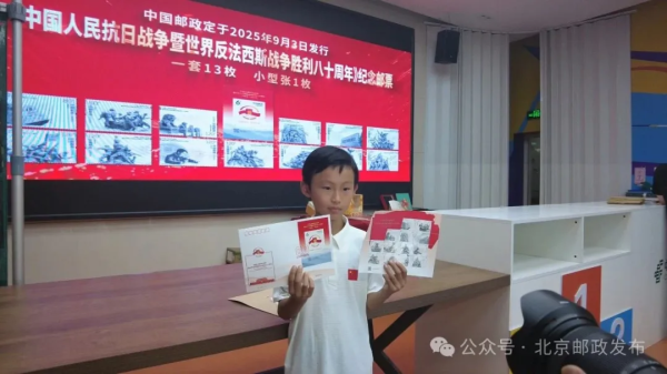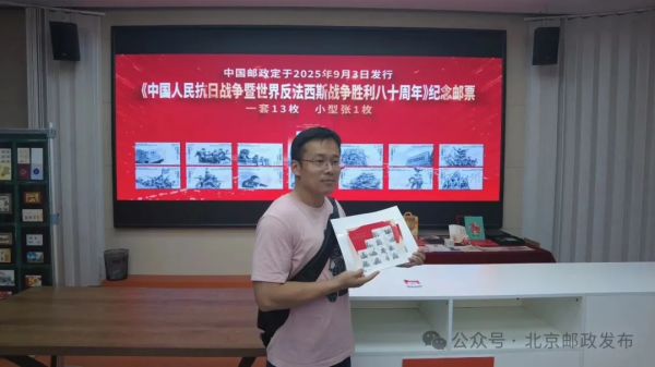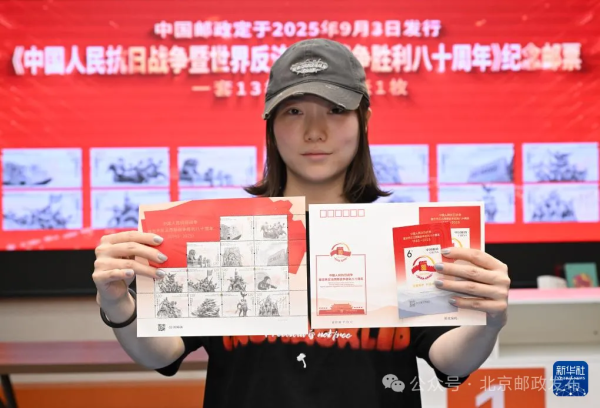 一位刚刚购买到《中国人民抗日战争暨世界反法西斯战争胜利八十周年》纪念邮品的年轻人在展示自己的最新收藏。