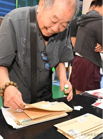 一位资深集邮爱好者正在将购买到的《中国人民抗日战争暨世界反法西斯战争胜利八十周年》纪念邮票贴在印制有“中国抗日战争纪念馆”字样的信封上。