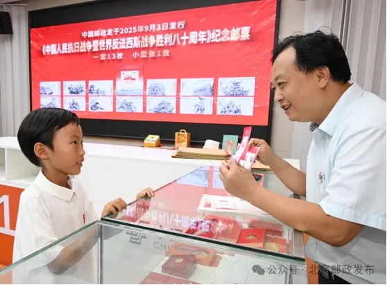 一位邮票销售人员在向购票的小朋友简单讲述该套《中国人民抗日战争暨世界反法西斯战争胜利八十周年》纪念邮票的发行背景。
