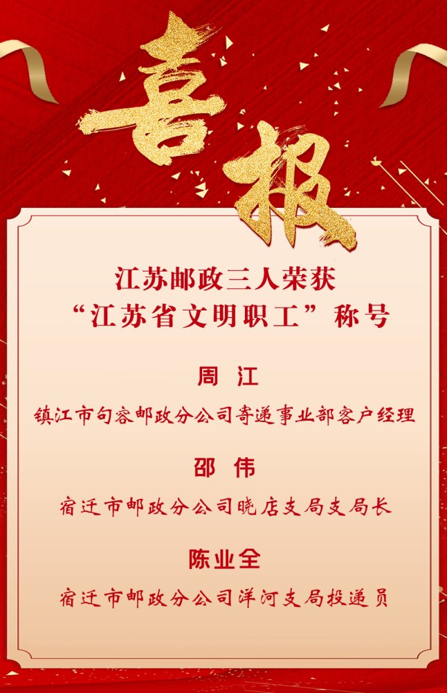 近日,省委宣传部、省总工会通报表彰第二十一届“江苏省文明职工”,镇江市句容邮政分公司寄递事业部客户经理周江、宿迁市邮政分公司晓店支局支局长邵伟、宿迁市邮政分公司洋河支局投递员陈业全等3名邮政员工获此称号。