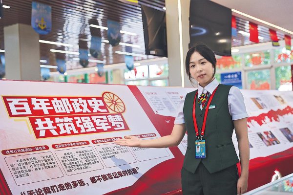 在“百年邮政史 共筑强军梦”文化墙前,邮政工作人员为大家介绍用一枚枚邮票串联起来的峥嵘岁月。