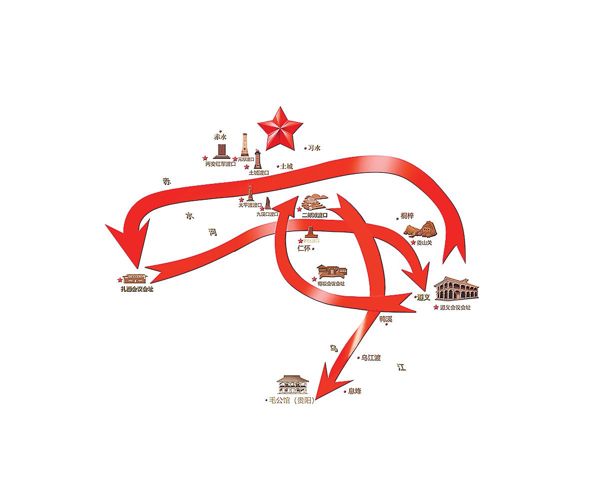 唐云云介绍,将红军“一渡赤水”(遵义—土城—扎西)、“二渡赤水”(扎西—太平渡—娄山关—遵义)、“三渡赤水”(遵义—苟坝—茅台—川南)、“四渡赤水”(二郎滩—太平渡—贵阳)的迂回路线在地图上连线,惊讶地发现其天然构成了一个“安”字的轮廓。“我们在‘安’字头上加了一颗五角星,这既是革命精神的象征,也含平安的寓意。希望游客看到时,能想到当下的幸福生活来之不易。”唐云云说。