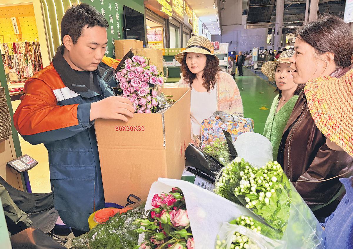 春日的云南昆明斗南花卉市场,鲜切花交易火热。昆明市邮政分公司在市场设立收寄服务点,采用海绵插槽固定花束、底部保水防护等工艺,并在寄递箱上标注“鲜花”字样,以便优先处理,保障“云花”新鲜送达全国各地。3月以来,昆明邮政在斗南花卉市场日均揽收鲜花邮件五六千件。