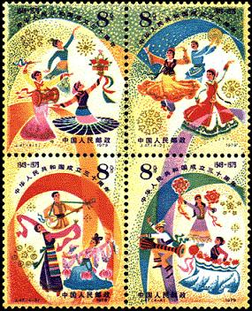 本套邮票共4枚,以四连张的形式表现“欢庆”的主题。画面上是各族人民载歌载舞,欢庆中华人民共和国成立三十周年的场面,背景是火树银花和飘舞的彩带。