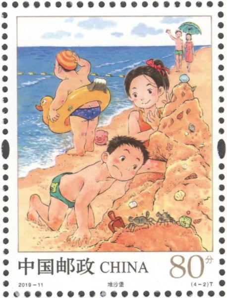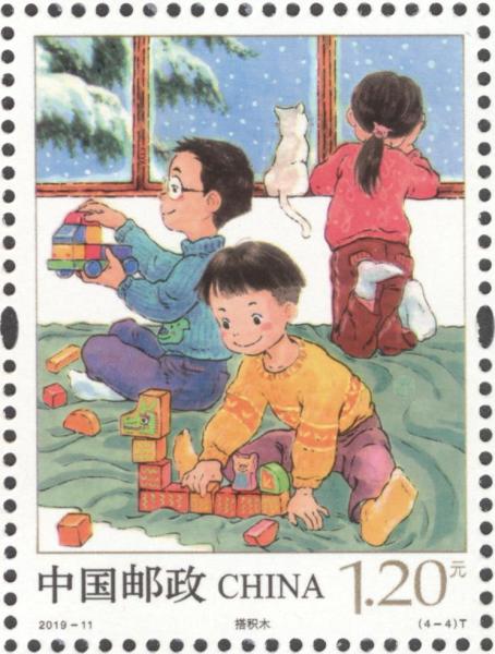 P.S. 本套邮票描绘了拼拼图、堆沙堡、滑轮滑、搭积木四种广受现代儿童喜爱的游戏,两种益智类、两种体育类,其中第一图的拼长城内容呼应了庆祝新中国成立70周年的概念。