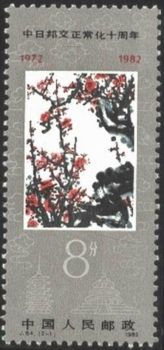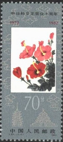 1982.9.29。影写版。P11。27mm*60mm。35(7*5)。[G]。 [A](2-1)关山月。(2-2)肖淑芳。 [D]万维生。北京邮票厂。 1982年9月29日,是中日邦交正常化10周年纪念日。本套邮票共2枚。 2-1为“梅花”。主图为怒放的梅花。邮票图案采用著名画家关山月的作品。用傲霜斗雪的梅花象征中国人民高贵的品格。 2-2为“扶桑”。主图为鲜艳的扶桑。邮票图案由著名画家肖淑芳绘制。扶桑象征日本。因为日本自古有扶桑国之称。