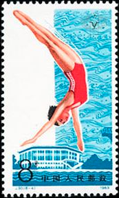 6-4为“跳水”。背景为浅蓝色,画面为一身着红装的女跳水运动员正凌空飞起,如博击长空的海燕。