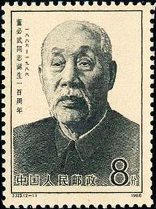 1986.3.5。影雕套印。P11.5*11。 30mm*40mm。 50(10*5)。 [G]。 [D]&[E] 李庆发。 北京邮票厂。 2-1为“董必武同志像”。 2-2为“董必武同志1945年在旧金山参加联合国制宪会议”。