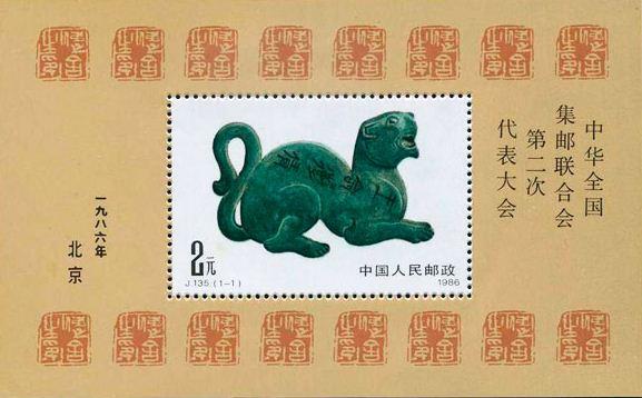 中华全国集邮联合会第二次代表大会于1986年 10月17日至21日在北京举行。这次大会审议并通过了新的“中华全国集邮联合会章程”;选举了中华全国集邮联合会第二届理事会和常务理 事会。 小型张采用 故宫博物院收藏的战国邮驿凭证——虎节,装饰则为战国用的封泥印。