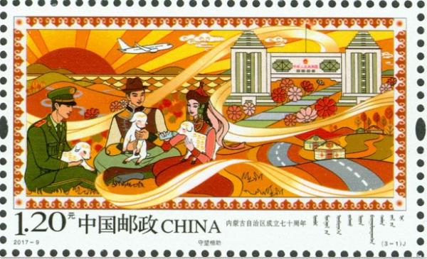 中国邮政2017年5月1日发行《内蒙古自治区成立七十周年》纪念邮票1套3枚。