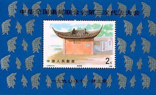 横塘驿亭。a. “第”字第九笔封口。 1990.11.28。影写版。P11.5*11。 [G]。刘硕仁。北京邮票厂。 小型张规格:130mm*80mm。 邮票规格:60mm*40mm。 为纪念中华全国集邮联合会第三次代表大会的召开,邮电部特发行纪念邮票小型张1枚。邮票图案以中国古代驿站姑苏驿横塘驿亭为主图,四周用宝石蓝色衬底,饰以古代“鱼”形铭文。