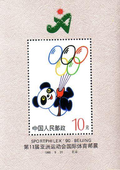 “第十一届亚洲运动会国际体育集邮展览”小型张,是为该次邮展募资而发行的,共1枚。小型张邮票主图是亚运会吉祥物熊猫盼盼,邮界俗称“盼盼”张,面值10元,内供集邮协会会员集藏。该张发行时未予编定志号。因此这枚小型张也是我国第一枚无编号小型张。