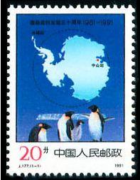 全套邮票1枚。画面用大面积的白色绘制出南极地图,表现出南极98%左右的区域被冰雪覆盖的“白色大陆”特点。画面中把南极最有代表性的生物——企鹅 表现得悠然、安祥,以示南极永远为和平的目的而使用。 邮票的色调偏冷,蓝色、白色的搭配,表现出南极世界的纯净无瑕,这也正符合南极无污染、海天一色、蓝的可爱、白的纯洁的自然景观。