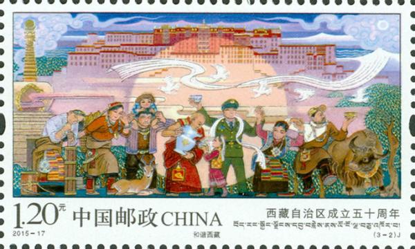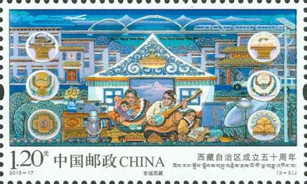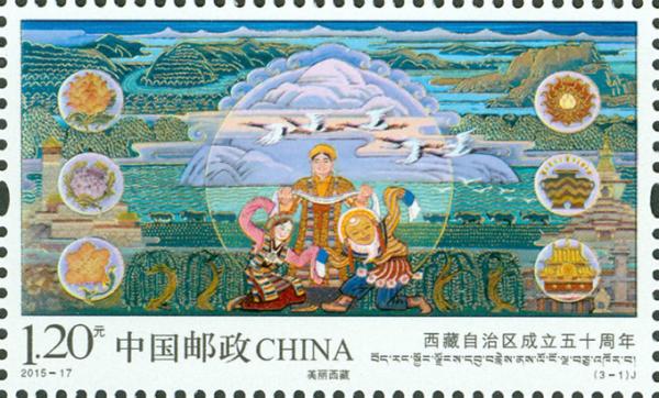 中国邮政2015年9月1日发行《西藏自治区成立五十周年》纪念邮票1套3枚。