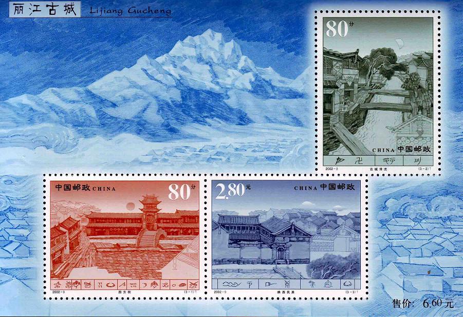 国家邮政局2002年5月1日发行《丽江古城》特种邮票1套3枚。