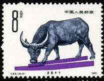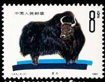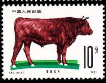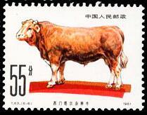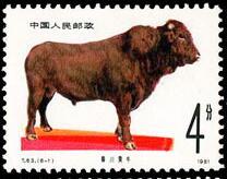 (1) 4分 秦川黄牛 493.16万枚 (2) 8分 滨湖水牛 1084.16万枚 (3) 8分 牦牛 1103.16万枚 (4) 8分 中国黑白花奶牛 919.16万枚 (5)10分 草原红牛 609.16万枚 (6)55分 西门塔尔杂种牛 178.16万枚 1981.5.5。影写版。P11×11.5。40×30mm。50(5×10)。 黄里。北京邮票厂。