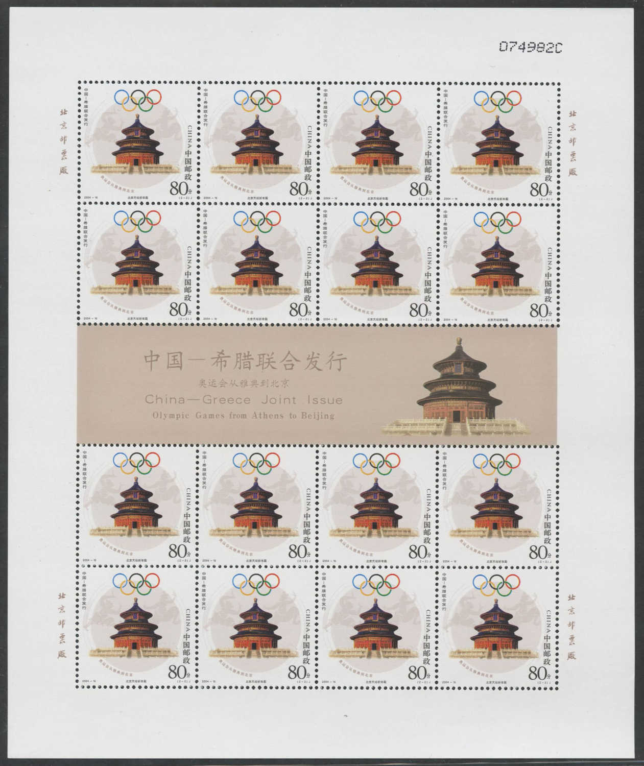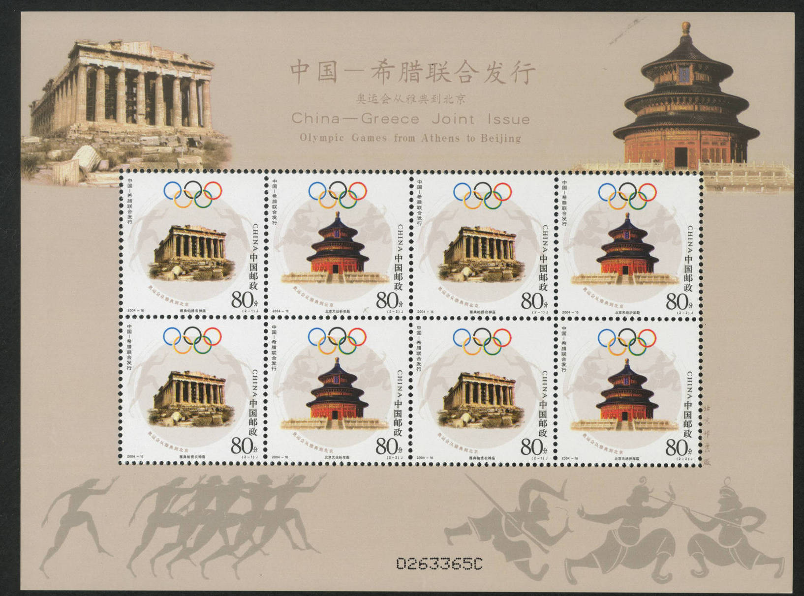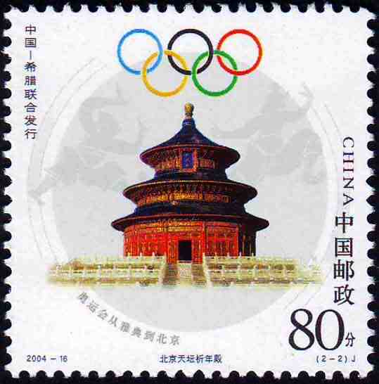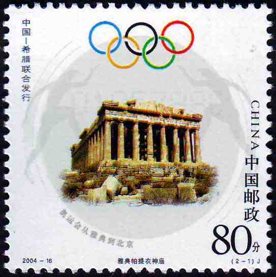 国家邮政局2004年8月13日发行《奥运会从雅典到北京》纪念邮票1套2枚(与希腊联合发行)。
