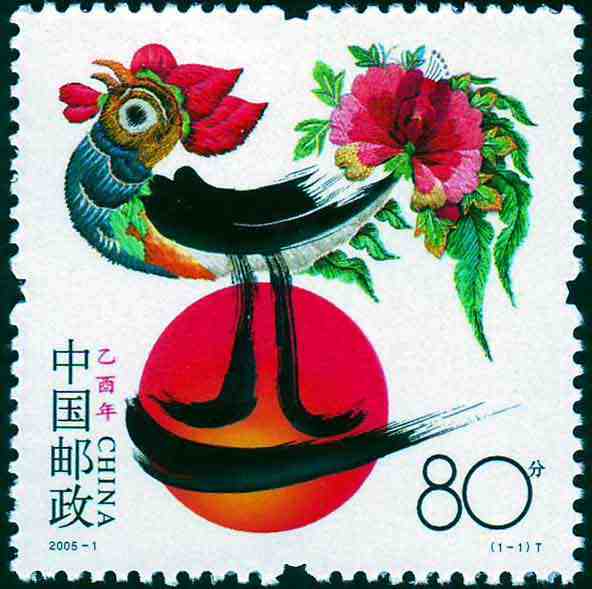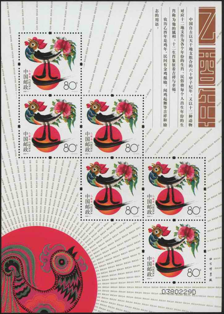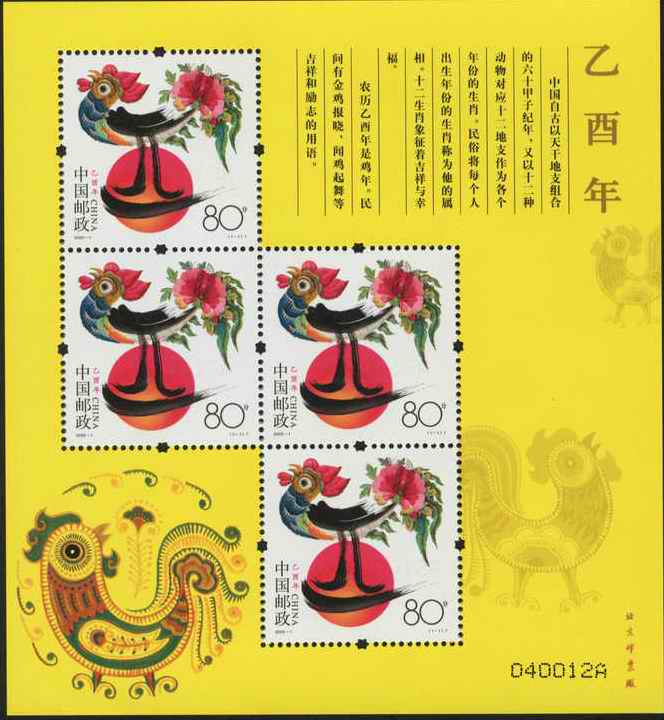 注:国家邮政局同时发行《乙酉年》邮票版式三(整张枚数:4枚;整张规格:120×130毫米),作为2005年纪特邮票全额交款预订户赠品。
