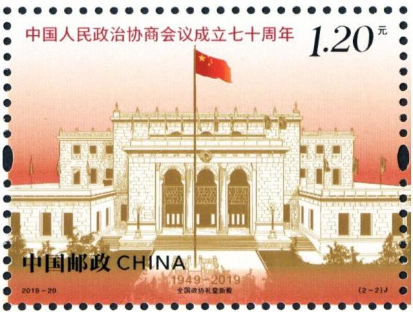 邮票第二图展现了人民政协的象征——全国政协礼堂的形象。人民政协从怀仁堂到政协礼堂的历史延续和发展,象征着中国共产党领导的多党合作和政治协商制度70年来书写的光辉篇章。设计者结合古典铜版绘画与色彩归纳的艺术表现手法,在表现内容与设计风格上与第一枚邮票图案形成呼应,突出政协礼堂建筑庄严、肃穆、典雅、大方的形象。