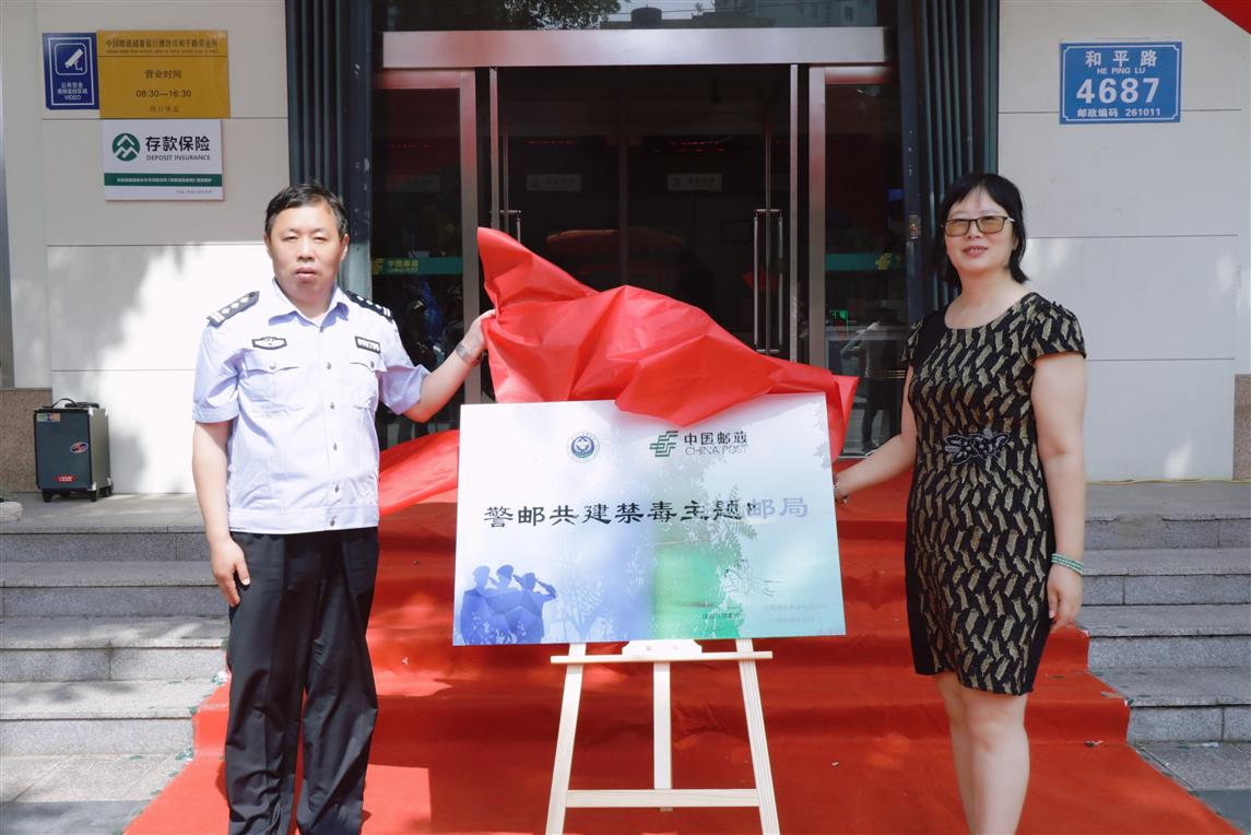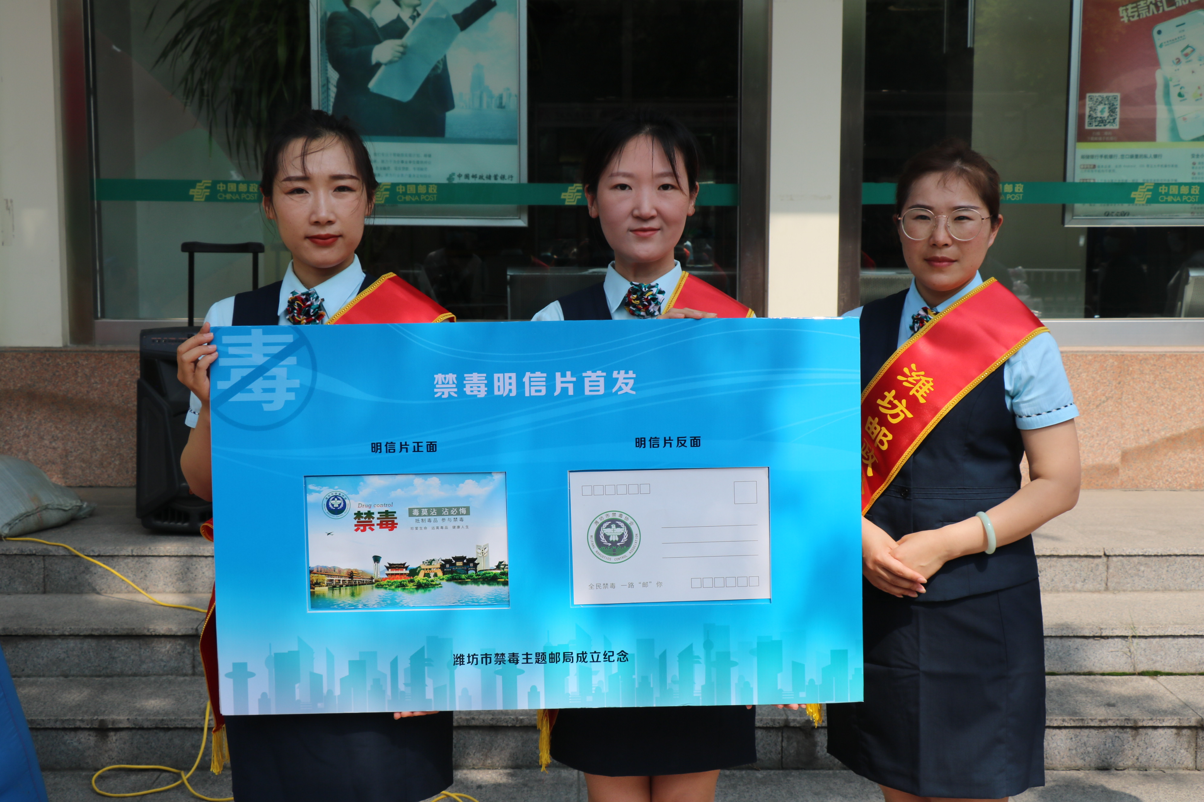 日前,潍坊市首个禁毒主题邮局揭牌成立。潍坊市邮政分公司、市公安局禁毒支队和市禁毒协会等相关单位和部门领导出席此次活动。现场,大学生禁毒志愿者、邮政义务宣讲员和部分市民共同见证禁毒主题邮局揭牌及禁毒明信片首发。