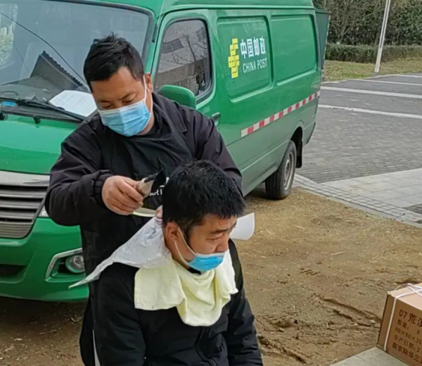 对于每天要“抛头露面”的邮政揽投员来说,剃头这件日常小事在疫情管控期间成了“头”等大事。趁中午邮车还没到的时机,陆伟戴好口罩,做好防护,喷壶湿润头发,剪刀、梳子与电推交替,不到15分钟,“慵懒风”揽投员立刻变身精气神小伙儿。一番熟练操作后,营投部6名同事形象得到了升级,大伙对自己的新造型非常满意。